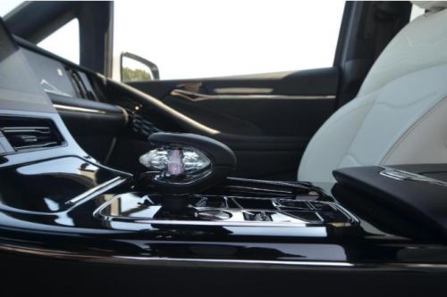 當(dāng)然,此種風(fēng)格下,有意思的地方還是有的。換擋中間配有一個(gè)可旋轉(zhuǎn)的水晶件,既能把玩屬性拉滿,又能對(duì)整車(chē)內(nèi)部風(fēng)格做一個(gè)提拉;位于副駕駛前面的北美黑胡桃木裝飾,通過(guò)“真木嵌銅”工藝,將云山珠水剪影之形現(xiàn)于其上,中式豪華氣息一下就上來(lái)了……