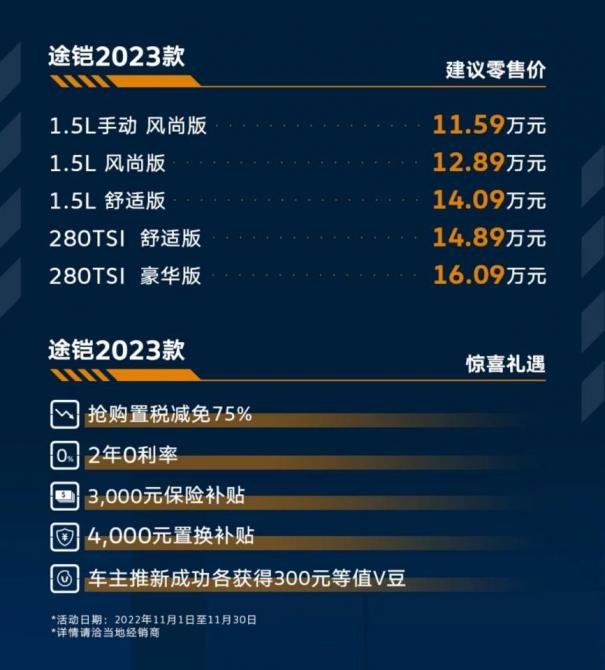 大眾途鎧作為深受年輕消費者喜歡的車型,如今迎來了2023款。2022年10月31日,上汽大眾大眾品牌T-Cross途鎧2023款上市,帶來5款配置車型,建議零售價11.59-16.09萬元。 途鎧2023款車身色彩大煥新、IQ.智慧車聯(lián)功能升級、舒適性配置也有所提升,披上“實力之鎧”,追尋夢想之路如虎添翼。