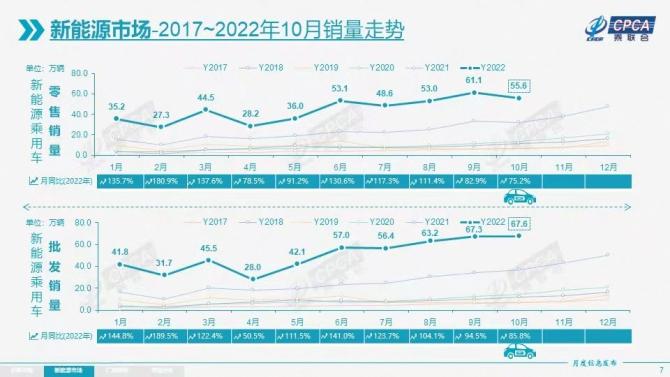 銷量持續(xù)增長的同時,新能源乘用車的滲透率也進一步提升。乘聯(lián)會數(shù)據(jù)顯示,10月新能源車國內(nèi)零售滲透率30.2%,較2021年10月18.5%的滲透率提升11個百分點。10月,自主品牌中的新能源車滲透率52.9%。