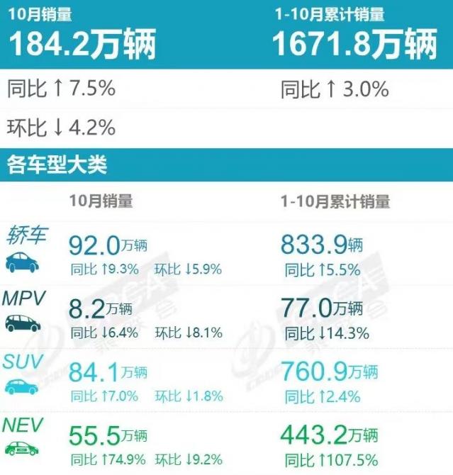據(jù)乘聯(lián)會數(shù)據(jù),10月份國內(nèi)狹義乘用車市場零售銷量達184.2萬輛,同比增長7.5%,環(huán)比下降4.2%。因各地疫情反復(fù),經(jīng)銷商促銷活動受限,汽車市場需求轉(zhuǎn)弱,形成相對平淡的“金九銀十”。