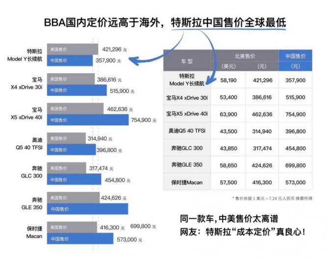 近日,有網(wǎng)友對(duì)中美兩地在售豪華車價(jià)格進(jìn)行對(duì)比,統(tǒng)計(jì)顯示,特斯拉Model Y長(zhǎng)續(xù)航版車型在美起售價(jià)約合人民幣42.13萬(wàn),國(guó)內(nèi)官網(wǎng)售價(jià)僅為35.79萬(wàn)元,低于美國(guó)售價(jià)6.3萬(wàn)元。值得注意的是,其他傳統(tǒng)豪華燃油品牌同級(jí)旗艦車型,中國(guó)售價(jià)均高于美國(guó)售價(jià),價(jià)格差距最大值高達(dá)近30萬(wàn)元。