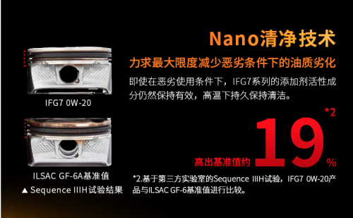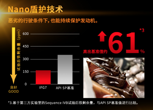 Nano盾護(hù)技術(shù),在惡劣行駛條件下依舊能夠?yàn)榘l(fā)動(dòng)機(jī)提供持續(xù)保護(hù),試驗(yàn)后鐵剩余量?jī)H為API SP基準(zhǔn)值的一半,保護(hù)性能高出61%。