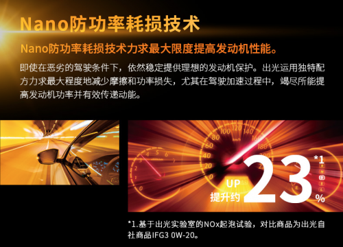 Nano防功率耗損技術(shù),運(yùn)用出光獨(dú)特配方力求最大程度地減少摩擦阻力和功率損失。和同類(lèi)0W-20機(jī)油相比,發(fā)動(dòng)機(jī)功率損耗降低23%。