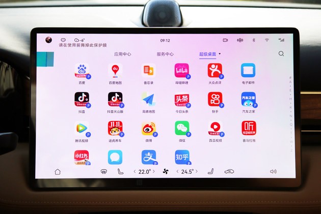 接下來我們切換到升級了鴻蒙OS 3測試版的體驗(yàn)車上,可以看到新版本在界面上還是有一些區(qū)別的。打開超級應(yīng)用菜單之后,可以看到大部分的第三方APP的右下角都多了一個(gè)藍(lán)色的小P標(biāo)識(shí),這就說明該應(yīng)用已可以適配車機(jī)屏幕。