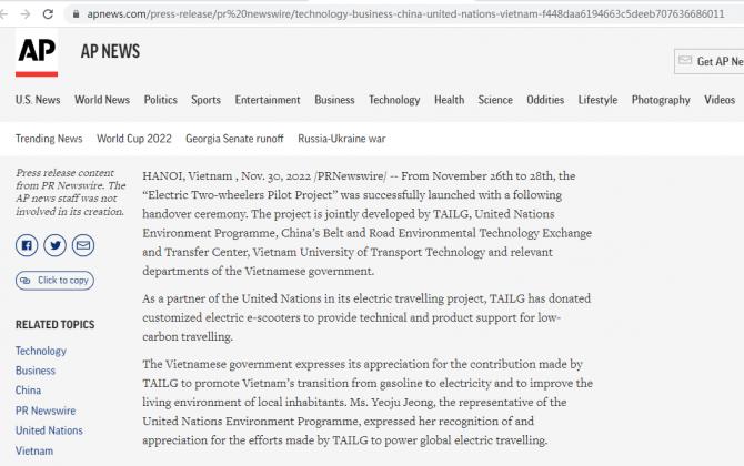 美聯(lián)社報(bào)道,“作為聯(lián)合國電動(dòng)出行合作伙伴,臺(tái)鈴積極參與全球環(huán)境和氣候改善項(xiàng)目,與聯(lián)合國環(huán)境規(guī)劃署合作,在全球范圍內(nèi)開展的電動(dòng)出行試點(diǎn)項(xiàng)目,向全球介紹了中國在低碳交通方面的豐富經(jīng)驗(yàn)和先進(jìn)的電動(dòng)車產(chǎn)業(yè)鏈。”