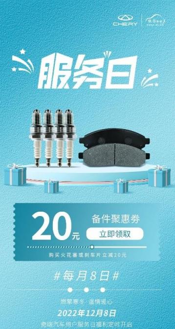 為了助力用戶冬季出行更加安全,奇瑞的每月服務(wù)日如期而至,特別為用戶送上一波聚惠福利,讓車檢更劃算。12月8日開始,用戶可通過“奇瑞車主俱樂部”小程序、奇瑞汽車APP進(jìn)入活動頁面,在“商城”參與1積分搶“20元備件聚惠券”, 該優(yōu)惠券可以用于火花塞、剎車片等實用備件優(yōu)惠,助您冬日車檢一臂之力。
