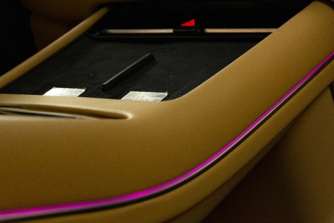 這份差異化的設(shè)計(jì)風(fēng)格,也隨著車外的空氣進(jìn)入到了車內(nèi)。打開車門,再關(guān)上車門,問界M7就已經(jīng)帶給人一定的驚喜。這份驚喜倒不是什么如絲般的關(guān)門這樣玄學(xué)的東西,而是它把手上方的木紋飾板和把手下方的細(xì)軟麂皮,在視覺和觸覺上有著理想L9與小鵬G9簡約現(xiàn)代風(fēng)格難于匹敵的溫馨感。車門上鑲嵌的多個(gè)LED氛圍燈,又為問界M7的座艙點(diǎn)綴了些許豪華感。