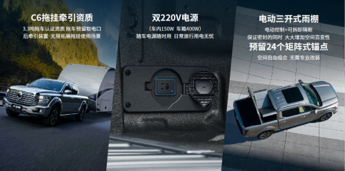 在后車箱拖掛玩法方面,山海炮還支持帶上你的拖拽機(jī)車、路亞艇、房車、摩托艇等,開啟更為玩味十足的戶外休閑生活。山海炮具備C6拖掛牽引資質(zhì),滿足3.3噸拖車認(rèn)證資質(zhì),并且拖車預(yù)留取電口、后牽引裝置,能夠無限拓展拖掛的使用場景。