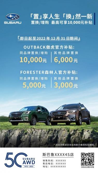 自即日起,一直到2022年12月31日,均可以參與斯巴魯汽車推出的置換/增購補貼。斯巴魯傲虎同品牌置換/增購可享受10000元的補貼,其他品牌置換亦可以獲得6000元的補貼。而斯巴魯森林人同品牌置換/增購可享受5000元的補貼,其他品牌置換亦可以獲得3000元的補貼?;顒咏刂箷r間將至,對斯巴魯汽車感興趣的用戶,快快行動起來吧!