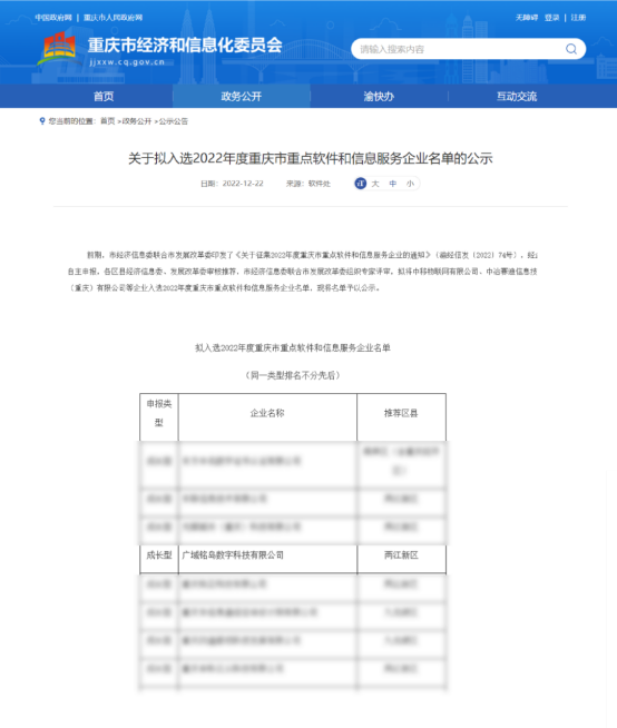 近日,廣域銘島入圍2022年度重慶市重點(diǎn)軟件和信息服務(wù)企業(yè)名單。本次市重點(diǎn)軟件和信息服務(wù)企業(yè)征集自9月啟動(dòng),對(duì)申報(bào)企業(yè)的軟件業(yè)務(wù)收入、研發(fā)費(fèi)用占比、研發(fā)人才占比、知識(shí)產(chǎn)權(quán)數(shù)量等多方面均有嚴(yán)格評(píng)審要求,旨在加快培育一批有影響力的市級(jí)重點(diǎn)軟件和信息服務(wù)企業(yè)。