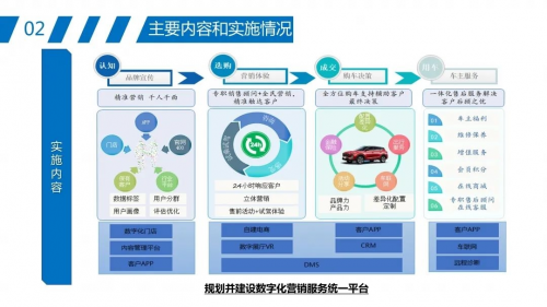 在智能營銷與服務(wù)領(lǐng)域,基于移動互聯(lián)網(wǎng)、云計算、大數(shù)據(jù)分析等技術(shù),江淮汽車打造了“智云互聯(lián)數(shù)字化營銷生態(tài)系統(tǒng)”。系統(tǒng)包括數(shù)字化營銷平臺建設(shè)、車聯(lián)網(wǎng)統(tǒng)一平臺總體架構(gòu)建設(shè)、用戶手機APP設(shè)計和部署、汽車診斷服務(wù)平臺建設(shè)等部分。系統(tǒng)為企業(yè)和用戶提供了雙向優(yōu)化的數(shù)字化轉(zhuǎn)型,實現(xiàn)了數(shù)據(jù)貫通與業(yè)務(wù)集成并舉,全方位立體轉(zhuǎn)型;實現(xiàn)服務(wù)意識和模式全面變革,由被動轉(zhuǎn)為主動;實現(xiàn)數(shù)字化與業(yè)務(wù)化互動創(chuàng)新,令數(shù)字化賦能業(yè)務(wù),被評選為2020年國有企業(yè)數(shù)字化轉(zhuǎn)型優(yōu)秀案例。