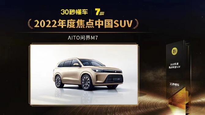 2022年12月16日,問(wèn)界M7憑實(shí)力斬獲第十屆軒轅獎(jiǎng)“年度十佳汽車(chē)”和30秒懂車(chē)“2022年度焦點(diǎn)中國(guó)SUV”兩項(xiàng)大獎(jiǎng)。