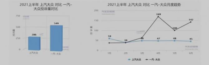 汽車設(shè)計(jì)決定了一個(gè)車企能有多少用戶,而用戶口碑則是評(píng)判車企的重要標(biāo)準(zhǔn)。這里我們提取出2021年上半年上汽大眾、一汽大眾的消費(fèi)者投訴率圖表,可以看出,一汽大眾的消費(fèi)者投訴率遠(yuǎn)高于上汽大眾,這表示一汽大眾在汽車品質(zhì)、售后服務(wù)等方面還有較大的提升空間。