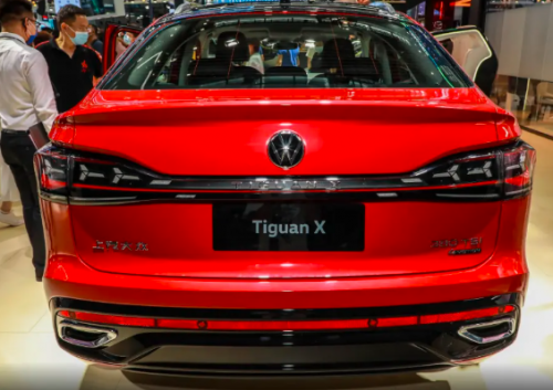 來到車身尾部,上汽大眾途觀X(Tiguan X)的尾部采用了時(shí)下最為流行的貫穿式尾燈,燈腔內(nèi)部由多個(gè)不同造型的光源組合而成,燈組整體進(jìn)行了熏黑處理,在夜間點(diǎn)亮之后具有非常不錯(cuò)的視覺效果。尾部的擾流板翹起的弧度較為明顯,配合上底部雙邊雙出的排氣裝飾,使得該車的尾部也具有不錯(cuò)的運(yùn)動(dòng)感。