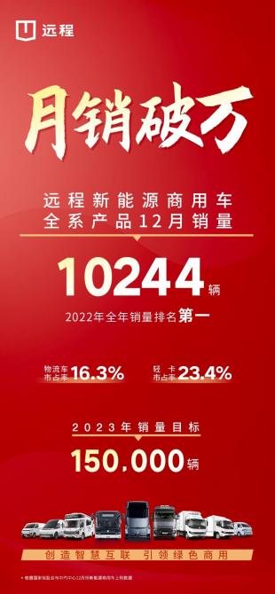 10244輛!根據(jù)國家保監(jiān)會與中汽中心12月份新能源商用車上險數(shù)據(jù)。遠程新能源商用車2022年12月銷量破萬,再次刷新行業(yè)記錄。細分領(lǐng)域,遠程新能源輕卡以23.4%市占率連續(xù)兩年蟬聯(lián)行業(yè)第一,這意味著行業(yè)中每賣出四輛新能源輕卡就有一輛是遠程。