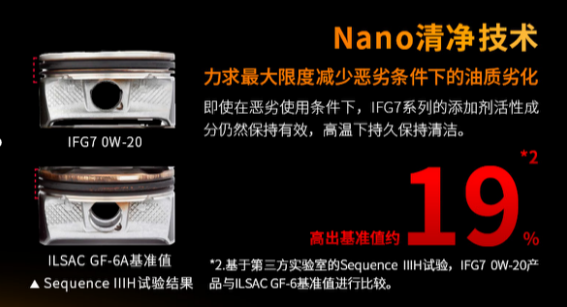 出光推出全新IFG系列產(chǎn)品,讓更多的車主能夠享受到出光最新專利制油技術(shù)制成的高品質(zhì)全合成油。為了提供一種讓駕駛者最為放心的駕駛需要,令駕駛者獲得更豐富、更自信的駕駛體驗(yàn),IFG7產(chǎn)品有著三項(xiàng)獨(dú)有的Nano技術(shù)。首先是,Nano護(hù)盾技術(shù),在惡劣行駛條件下依舊能夠?yàn)榘l(fā)動機(jī)提供持續(xù)保護(hù),試驗(yàn)后鐵剩余量僅為API SP基準(zhǔn)值的一半,保護(hù)性能高出61%。其次是Nano防功率損耗技術(shù),運(yùn)用出光獨(dú)特配方力求最大程度地減少摩擦阻力和功率損失。和同類0W-20機(jī)油相比,發(fā)動機(jī)功率損耗降低23%。最后是Nano清凈技術(shù),Nano清凈技術(shù)通過獨(dú)有添加劑配方,可以讓汽車在惡劣工況下,依舊保持穩(wěn)定、有效輸出,為發(fā)動機(jī)帶來更好的清潔效果。和同類產(chǎn)品相比,清潔度高于基準(zhǔn)值19%。