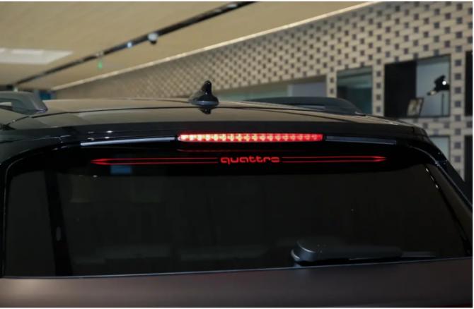 給我介紹說是,這整體的設(shè)計(jì)靈感來自“麒麟”,還有一個(gè)運(yùn)動(dòng)和行政的雙外觀選擇,不管懂不懂吧,反正挺好看的就是了。而且,讓我特意留意了兩個(gè)和以往奧迪不一樣的地方。一個(gè)是前面使用的貫穿式LED燈帶,說是奧迪首次采用這樣的設(shè)計(jì)。另一個(gè)就是,后擋風(fēng)玻璃上,踩剎車時(shí)會(huì)有“quattro”字樣紅色光影顯示,非常有意思。