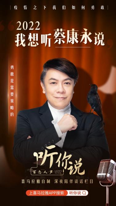 蔡康永將在12月27日21點在喜馬拉雅《聽你說》節(jié)目中直播暢談“疫情下我們?nèi)绾斡赂摇痹掝},并在線與聽友連麥。2022年是充滿變數(shù)的一年,我們無法避免被時代洪流裹挾,只好著眼當(dāng)下,像是一種不認(rèn)命的執(zhí)拗,總要做出一些改變,才能感受到進(jìn)步和活著。年終之際,蔡康永將作為喜馬“抱抱團(tuán)”主持人,在直播中收集那些勇于堅持和改變的故事,從中汲取力量,重拾我們對生活的熱愛與信仰。12月28日21點的直播中,蔡康永將以年終問答的形式,在與聽友的連麥中分享自己對2022年各種話題的思考。