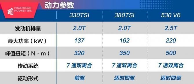 2.5T V6最大功率220kW、最大扭矩為500N·m,官方0-100km/h加速時(shí)間僅為7.2秒,成績(jī)非常出彩,同時(shí)這也是該級(jí)別中性價(jià)比最高的V6發(fā)動(dòng)機(jī),對(duì)于追求強(qiáng)勁動(dòng)力和大排量的消費(fèi)者來說誘惑力不小。