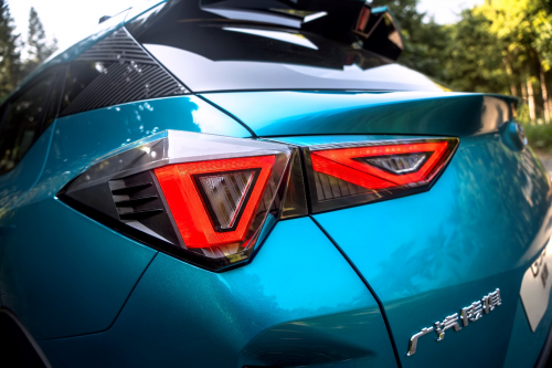 此外,設(shè)計(jì)師還將汽車人的面部形態(tài)應(yīng)用到設(shè)計(jì)細(xì)節(jié)上。前臉的H 型設(shè)計(jì)猶如汽車人的面具護(hù)盔,鐳射之眼大燈猶如汽車人雙目,亮起時(shí)如激光穿透。光鏢尾燈則如同汽車人的背部噴射器,在三角形切割元素的貫穿使用下充滿速度張力。
