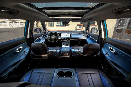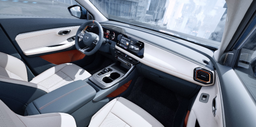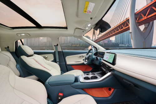 在內(nèi)艙設(shè)計(jì)上,設(shè)計(jì)師通過門板和儀表臺(tái)的環(huán)繞主題設(shè)計(jì),加上整體內(nèi)凹的型面處理,消解厚重的體量感,在 A0 級(jí)有限的空間條件下,實(shí)現(xiàn)了更精致的形式美和更暢闊的空間感。