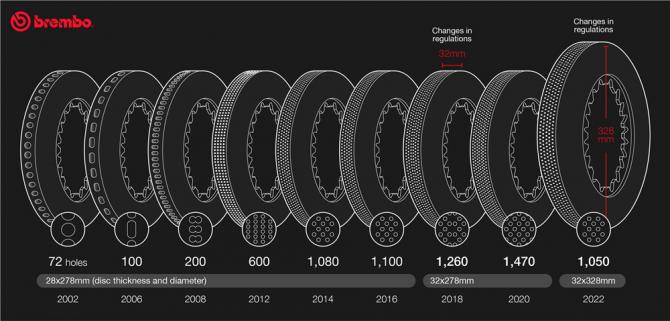 過去二十載,布雷博徹底革新了F1制動盤的設(shè)計理念。21世紀之初,布雷博的碳纖維制動盤厚度為28mm,單排最多有72個通風孔,直徑超過10mm。如今,前軸碳盤的直徑從278mm增至328mm,后軸碳盤的直徑從266mm增至280mm;前制動盤厚度為32mm,有1000到1100個通風孔,后制動盤有900個通風孔,最大程度提升冷卻效果。