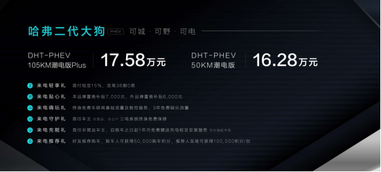 哈弗二代大狗PHEV版共有兩款車型供大家選擇,分別為:1.5T DHT-PHEV 50km 潮電版(下文簡(jiǎn)稱:潮電版),售價(jià)16.28萬(wàn)元;1.5T DHT-PHEV 105km 潮電版Plus(下文簡(jiǎn)稱:潮電版Plus),售價(jià)17.58萬(wàn)元,兩款車型價(jià)差1.3萬(wàn)元,區(qū)別主要分為電混表現(xiàn)、智能駕駛、智慧座艙三部分。