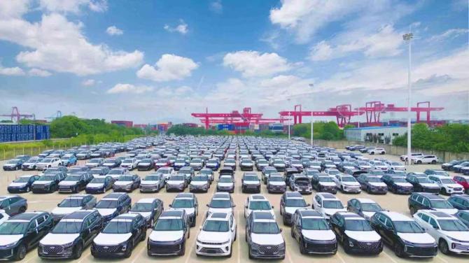 (圖為港口物流待發(fā)全球市場(chǎng)的奇瑞汽車各品牌車型)