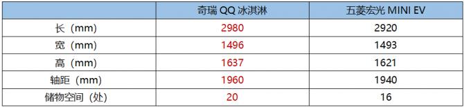 同時,奇瑞QQ冰淇淋還擁有20處儲物空間,輕松滿足大人和孩子放置各種物品需求。而五菱宏光MINI EV 則配備了16處儲物空間,儲物空間略少。