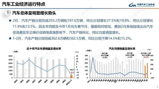中汽協(xié)數(shù)據(jù)顯示,2月,汽車(chē)產(chǎn)銷(xiāo)分別完成203.2萬(wàn)輛和197.6萬(wàn)輛,環(huán)比分別增長(zhǎng)27.5%和19.8%,同比分別增長(zhǎng)11.9%和13.5%。因去年同期及今年1月均為春節(jié)月,基數(shù)相對(duì)較低,疊加2月各地陸續(xù)出臺(tái)汽車(chē)促消費(fèi)及車(chē)企降價(jià)促銷(xiāo)等政策影響下,汽車(chē)產(chǎn)銷(xiāo)環(huán)比、同比均呈明顯增長(zhǎng)。1-2月,汽車(chē)產(chǎn)銷(xiāo)分別完成362.6萬(wàn)輛和362.5萬(wàn)輛,同比分別下降14.5%和15.2%。