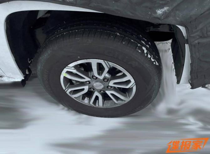 車頭部分為三橫幅鍍鉻裝飾的車型,編輯判斷是重用版或越野版,原因是鍍鉻工藝的亮度將其襯托的更加別致,并且貨廂部分沒(méi)有龍門(mén)架,這樣的設(shè)計(jì)更加方便后期加裝外拓設(shè)備,比如蓋板或是多功能框架,能夠迎合不同的出行需求。輪胎部分,諜照車型裝配的是265/65 R17的佳通牌輪胎。