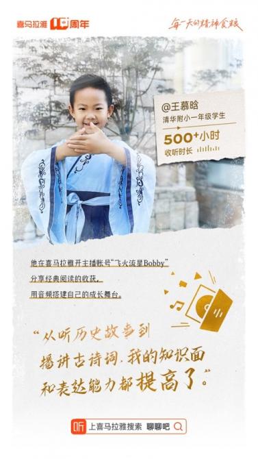 王慕晗是清華附小一年級(jí)學(xué)生,今年7歲,早在慕晗還不識(shí)字的幼兒時(shí)期,他的爸爸就會(huì)給他念古詩(shī),并在喜馬拉雅上挑選了許多適合兒童聽(tīng)的國(guó)學(xué)教育音頻。后來(lái),在喜馬拉雅大量的國(guó)學(xué)文化音頻浸染下,慕晗有了想自己錄制音頻講古詩(shī)詞的想法,他直接在喜馬拉雅APP內(nèi)錄制和剪輯,很快就做好一期節(jié)目。音頻就像是慕晗的日記本,隨時(shí)記錄下他的成長(zhǎng)點(diǎn)滴。大量的兒童群體在喜馬拉雅提供的內(nèi)容豐富的資源池的潤(rùn)養(yǎng)下快樂(lè)成長(zhǎng),平臺(tái)的育人價(jià)值得到了很好的發(fā)揮。