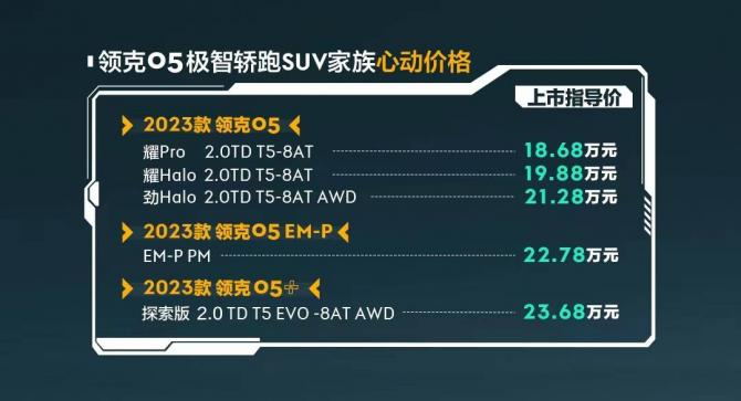 2023年3月21日,領(lǐng)克05極智轎跑SUV家族以“一眼來電 極智如05”為主題煥新上市。2023款新車提供領(lǐng)克05、領(lǐng)克05 EM- P、領(lǐng)克05+三款車型可選,官方指導(dǎo)價(jià)分別為18.68-21.28萬元、22.78萬元、23.68萬元。為給用戶帶來進(jìn)階極致體驗(yàn),領(lǐng)克05極智轎跑SUV家族在個(gè)性、智能和駕控上全面進(jìn)階,持續(xù)滿足消費(fèi)者不斷提升的高階用車需求。