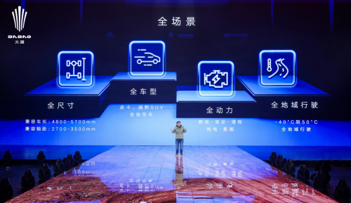 “巡天架構(gòu)”覆蓋全尺寸、全車型、全動力、全地域的車型開發(fā)需求。在巡天架構(gòu)下,可以兼容2700-3500mm的軸距、4800-5700mm的車長,覆蓋包括燃油、混動、增程、純電、氫能等不同動力,可生產(chǎn)皮卡、越野SUV和全地形車不同車型,甚至還能夠適應(yīng)-40°C到50°C的不同環(huán)境,經(jīng)得起不同地域的極限挑戰(zhàn)。