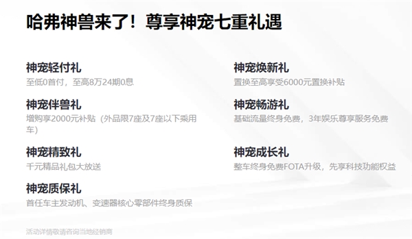設(shè)計有新意、用車有驚喜,哈弗神獸用可謂完美的表現(xiàn)成功折服了無數(shù)用戶的認可與支持。尤為值得一提的是,它的指導(dǎo)價格僅13萬元起,并且還在近期推出了至高8萬元24期0息、至高6000元置換補貼、至高2000元增購補貼、首任車主核心零部件終身質(zhì)保、整車終身免費FOTA升級等權(quán)益在內(nèi)的尊享神寵七重禮遇,以最大誠意讓更多用戶能夠體驗到這款科技旗艦帶來的全新出行體驗。