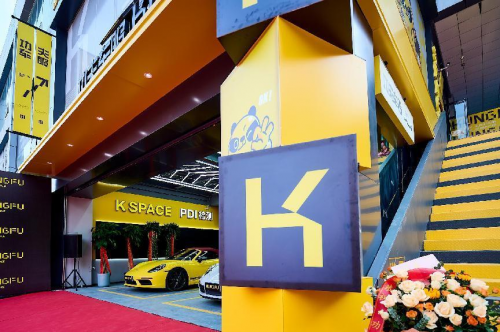 黃黑色主色、年輕力十足的品牌形象,動(dòng)感活力的FuFu熊IP,功夫車服K Space與傳統(tǒng)的汽車服務(wù)門店全然不同,看似像潮玩店,又像咖啡店……處處可見的超級(jí)符號(hào)“K”,更加加深了對(duì)門店的印象。