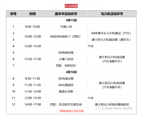 活動時間4月15日-16日活動地點重慶龍興通用機場活動內(nèi)容康士柏馬力機挑戰(zhàn)賽0-400米直線加速賽AIT Garage車聚嘉年華(定點剎車賽、低趴過桿賽)摩友聚會后備箱市集美食派對……