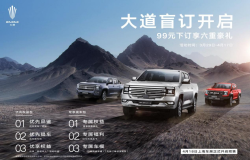 作為2023開年第一場行業(yè)盛會,參加上海車展的各家車企都已摩拳擦掌,江鈴大道更是蓄勢待發(fā),將有一系列大動作落地。隨著大道品牌誠意滿滿的盲訂政策,不僅讓其產(chǎn)品未上市先火爆,更讓人對其售價及預(yù)售政策充滿了期待。曾有消息稱,大道新車預(yù)計起售價格將不高于13萬元。屆時,大道是否會帶來如此驚喜的售價,以及其將建設(shè)怎樣的“大道”生態(tài),讓我們一起期待4月18日上海車展江鈴大道發(fā)布會!