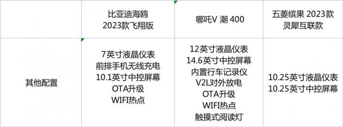 從三款車(chē)型的配置對(duì)比來(lái)看,比亞迪海鷗明顯科技感不足,液晶儀表盤(pán)和中控屏幕尺寸不僅比不上哪吒V,連繽果都比不過(guò),雖然屏幕尺寸不能和車(chē)機(jī)交互表現(xiàn)劃等號(hào),但視覺(jué)效果上就差了不少。五菱繽果在娛樂(lè)性方面也比較“擺爛”,很像五菱宏光MINI EV的縮小版,雖然價(jià)格乍一看確實(shí)低,但實(shí)際上,拿這款車(chē)和哪吒V售價(jià)8.39萬(wàn)元的中低配版本來(lái)比,也是有差距的。