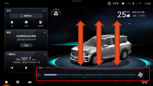GS8在空調(diào)設(shè)置系統(tǒng)桌面頁(yè)面增加了三指快捷調(diào)節(jié)風(fēng)量功能,通過(guò)上下滑動(dòng),快速調(diào)節(jié)空調(diào)風(fēng)量,為用戶(hù)打造更清爽舒適的駕乘空間。