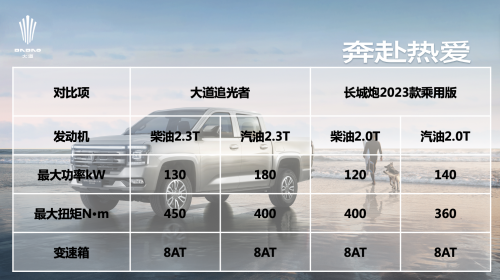 從上表中可以看到,大道追光者搭載了2.3T柴油/汽油發(fā)動機,其中,2.3T柴油發(fā)動機最大功率為130kW,扭矩為450N.m,全面領先于長城炮2023款乘用版;2.3T汽油發(fā)動機最大功率180 kW,扭矩為400N.m,同樣全面領先更有勁,帶來更強大的負重、爬坡、加速能力,各種路況均游刃有余。