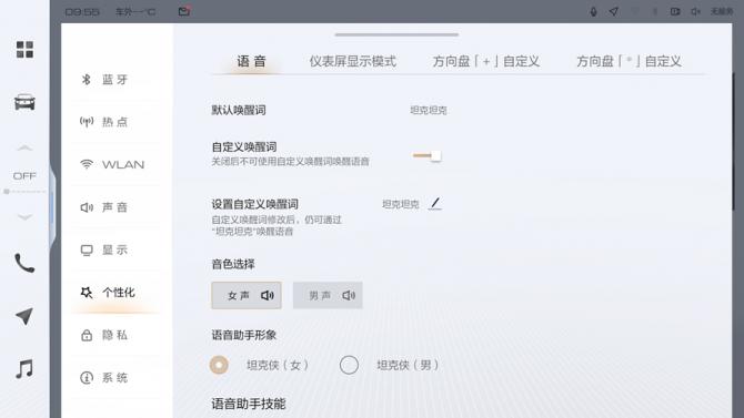 本次升級新增語音全車模式,開啟后全車統(tǒng)一為一個音區(qū),后排也可語音召喚語音助手;新增場景化語音指令,如“打開散味模式”、“打開吹風(fēng)模式”、“有點熱”等,結(jié)合實際用車場景,實現(xiàn)車窗及空調(diào)同時控制;新增語音提示功能,坦克俠將引導(dǎo)用戶在對應(yīng)場景下使用語音交互,解決“無從下嘴”問題。同時新增了語音與自定義語音喚醒開關(guān),用戶可自行選擇是否啟用語音助手,為不同偏好的車主營造更適宜的駕駛環(huán)境。
