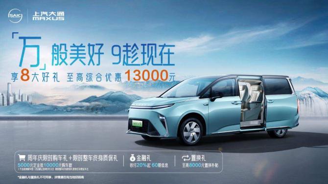綜合空間舒適度、安全表現(xiàn)和功能配置三方面考慮,可以看到上汽大通 大家MIFA9是比嵐圖夢想家更豪華、更舒適的家用選擇。另外,嵐圖夢想家MPV的起售價格在36.99萬,而大家MIFA9的起售價僅為26.99萬,并且現(xiàn)在上汽大通MAXUS還為購車用戶提供了周年慶限時購車禮+限時整車(含三電)終身質(zhì)保禮、試駕體驗禮、惠享金融禮和車電分離禮和舊車置換禮(三選一)、家用電樁禮、基礎流量禮等,至高綜合優(yōu)惠達到13000元(上海地區(qū)至高綜合優(yōu)惠23000元)。尤其是還帶有整車(含三電)終身質(zhì)保禮,令人心動,有購車需求的用戶可以放心沖!