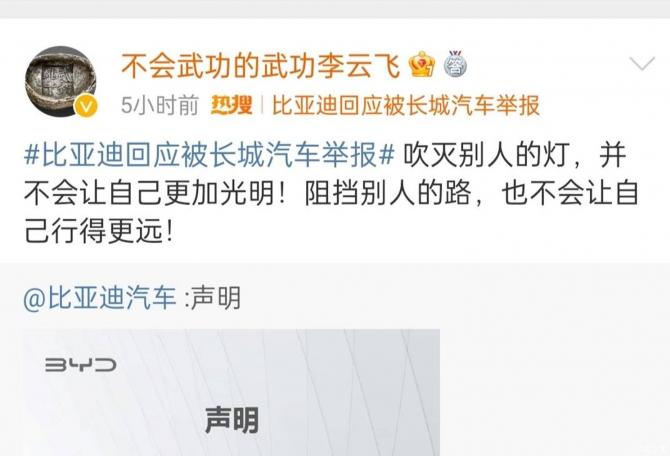 比亞迪多位高管就長城舉報事件發(fā)表聲明微博