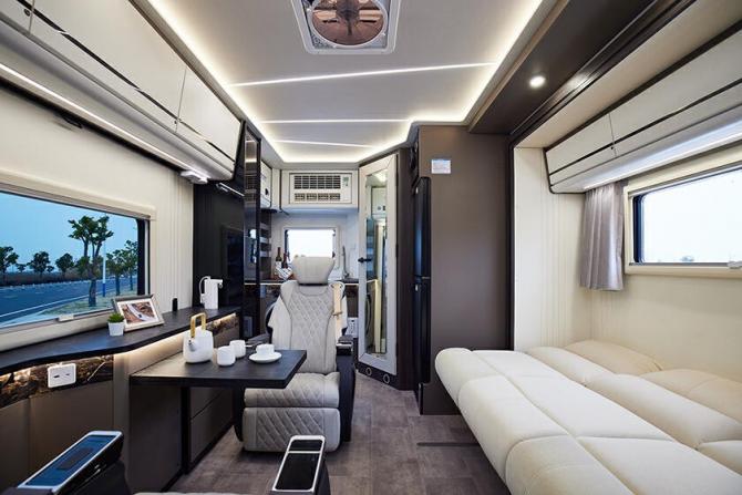 在此基礎(chǔ)上,生活家H90還配置了諸多實用“裝置”,微波爐、洗衣機、冰箱等一應俱全,可輔助商務出行更順暢。睡臥區(qū)域還有隱私拉簾和乳膠復合床墊和閱讀燈等,商務出行中途還可小憩一會,以良好的精力應對工作;卡座區(qū)的新一代乘用車級電動升降窗,在增加采光面積的同時,行車可開窗;投影儀+幕布、搭配4個JBL音響的“影音娛樂包”帶來沉浸式觀影享受;