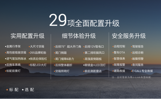 10大硬核領(lǐng)先,更是將整車空間、駕乘感受、智能交互、安全性能等做到了遠(yuǎn)超行業(yè)同級(jí)水平:新車尺寸為5450/5685x1935x1872mm,軸距3270/3470mm,貨箱(長(zhǎng)*寬*深)標(biāo)/長(zhǎng)箱:1546x1595x546mm/1785x1595x546,駕乘與裝載空間均領(lǐng)先同級(jí);前后12V取電接口、40W無(wú)線快充、貨箱220V/400W電源接口等配置,細(xì)節(jié)之處面面俱到,便捷性領(lǐng)先同級(jí);配備了12.3寸全液晶儀表盤、流媒體后視鏡等前瞻又實(shí)用的科技配置,智能交互領(lǐng)先同級(jí);全速超級(jí)巡航等L2.5級(jí)智能駕駛輔助技術(shù),讓駕駛更安全更輕松,智能駕駛領(lǐng)先同級(jí);30°+26°超大接近角及離去角,加上最小轉(zhuǎn)彎半徑6m,面對(duì)各種路況游刃有余,通過性領(lǐng)先同級(jí);20+聲學(xué)包、四門4mm超厚聲學(xué)玻璃,營(yíng)造圖書館級(jí)的安靜空間,靜謐體驗(yàn)領(lǐng)先同級(jí);高品質(zhì)雙拼皮質(zhì)座椅,加上負(fù)離子空調(diào)與PM2.5監(jiān)測(cè)系統(tǒng),營(yíng)造舒適健康的乘坐空間,駕乘品質(zhì)領(lǐng)先同級(jí);12.1寸可旋轉(zhuǎn)IVI大屏+10個(gè)高品質(zhì)音響+車載KTV系統(tǒng),讓座艙變身為移動(dòng)影視廳,娛樂享受領(lǐng)先同級(jí);而全時(shí)管家系統(tǒng),可通過遠(yuǎn)程控制實(shí)現(xiàn)車輛解鎖、發(fā)動(dòng)機(jī)啟動(dòng)、空調(diào)提前開啟等便捷功能,并包含遠(yuǎn)程診斷、故障預(yù)警等,安全守護(hù)領(lǐng)先同級(jí)。