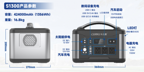 如果是想和大自然進一步接觸的戶外愛好者,想要來一場過夜的露營,則可以帶上一臺卡兒酷鐵鋰安全戶外電源S1300,容量更大,續(xù)航更長,增設AC接口,輸出功率達到1100W。