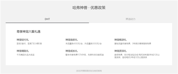 最后,現(xiàn)在選購哈弗神獸混動DHT,可享受哈弗官方提供的至低0首付、至高7萬24期0息,本品牌置換4000元/臺、外品牌置換3000元/臺,首保免費、動力電池包總成/電機控制器8年或15萬公里質保、驅動電機3年或10萬公里質保,整車終身免費FOTA升級等權益在內的尊享神寵六重禮遇,可以讓你輕松把這輛高品質混動SUV開回家。