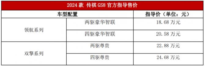 據(jù)了解,2024款傳祺GS8共推出領(lǐng)航兩驅(qū)豪華智聯(lián)版、領(lǐng)航四驅(qū)豪華智聯(lián)版、雙擎兩驅(qū)尊貴版、雙擎四驅(qū)尊貴版4款配置,價格和第二代GS8保持一致,為18.68萬元-24.68萬元,真正做到升艙不升價。