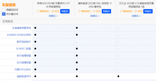 從上表來看,唐DM-i和2024款傳祺GS8在主動安全配置這方面都表現(xiàn)得很不錯,車道偏離預警、主動剎車、主動安全系統(tǒng)等配置應有盡有,安全感滿滿。